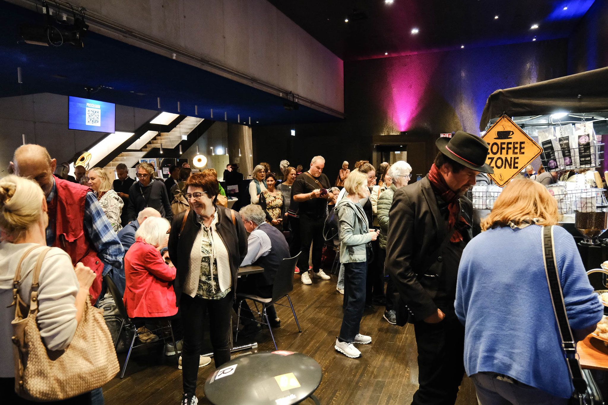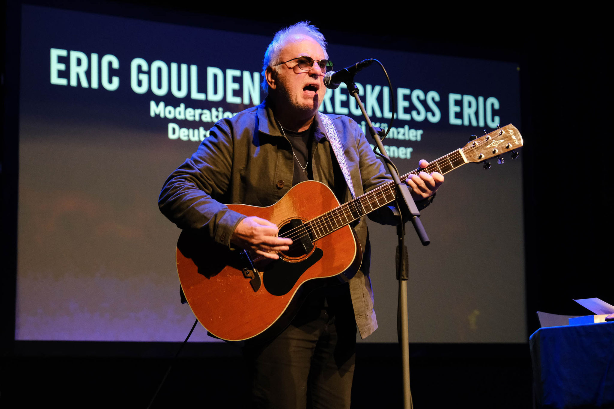 Der späte Freitagabend stand ganz im Zeichen der Musik. Als der Musikjournalist, langjährige SPRACHSALZ-Mitarbeiter und in London lebende Autor Hanspeter Düsi Künzler seine Hommage an sein Stadtviertel Kilburn vorstellte, stimmte der Folgegast Eric Goulden aka Wreckless Eric gleich mit einem Lied auf der Gitarre ein. Für die Lesung von Wreckless Eric nahm Künzler wieder seine gewohnte Rolle als Interviewer ein – ein dankbarer Job für das 71-jährige Energiebündel. Szenen aus der Lesung: Goulden, der mit seinem breiten Cockney-Akzent die Vorzüge der heuer erstmals eingesetzten Dolmetsch-KI aufzählte und sie dabei an ihre Grenzen brachte. Nach und nach verwob sich die Stimme von Ernst Gossner, der meisterhaft den Text auf Deutsch vortrug, mit der akustischen Version von Wreckless Erics Hit «Whole Wide World». Dass der 1974 geschriebene Song im letzten Jahr seinen 50. Geburtstag feierte, wurde Goulden erst beim großen Gala-Abend bewusst. Eine verpasste Chance, wie er selbst einräumte. Gut, dass am Samstagabend nachgefeiert wurde. Er brachte mit seiner Performance das Publikum zum Tanzen.