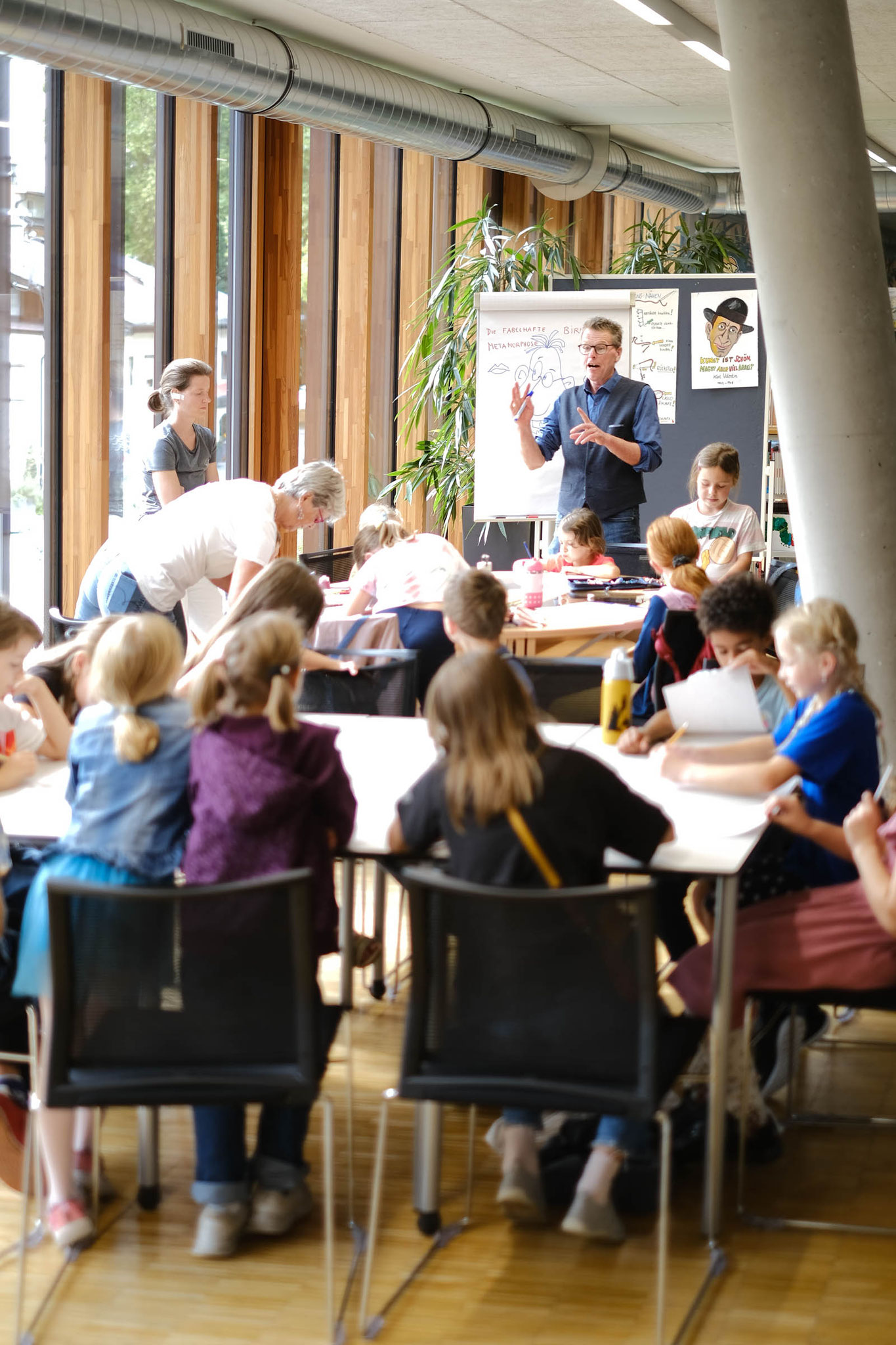 SPRACHSALZ MINI bot Kindern von 3-10 Jahren heuer Lesungen von Marco Kerler und Franz Hohler. Am Samstag fand die beliebte und sehr gut besuchte Bastelwerkstatt mit Christian Yeti Beirer statt: Vom Strichmännchen zum Comic, von ersten Schreibversuchen zu einer kleinen Geschichte und mit Nadel, Faden und Klammer zum eigenen kleinen Buch.