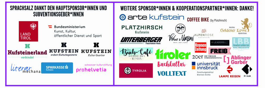 Arte Hotel Kufstein, Bar Vitus & Urban, Alpenrose Kufstein, Ablinger.Garber, Buch-Café Lipott Kufstein, Buchhandlung Tyrolia Kufstein, Galerie dia:log Kufstein, Hotel Goldener Löwe Kufstein, Internationales Literaturfestival Berlin, KUBI Kufstein Bibliothek für Wissenschaft & Freizeit, Kultur Quartier Kufstein, Lampe Reisen, Leaders.net, Literar-Mechana, ORF Ö1 Club, Presseclub Concordia, Pro Helvetia – Schweizer Kulturstiftung, Pro Helvetia – Schweizer Kulturstiftung, Tiroler Versicherung, Unterberger Automobile (Unterberger Gruppe), Volltext, «Zwanzger – Die Tiroler Straßenzeitung».